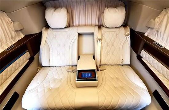 中央的首长席座椅多功多样,包括有多向电动调节、腿托、前后旋转等。两张座椅皮质与填充物方面都以舒适为主。上面的缝线也相当细腻,首长席折叠电脑桌闪耀,后排除了正常容纳三名乘客非常宽松的乘坐之外,还能将其完全放平。
