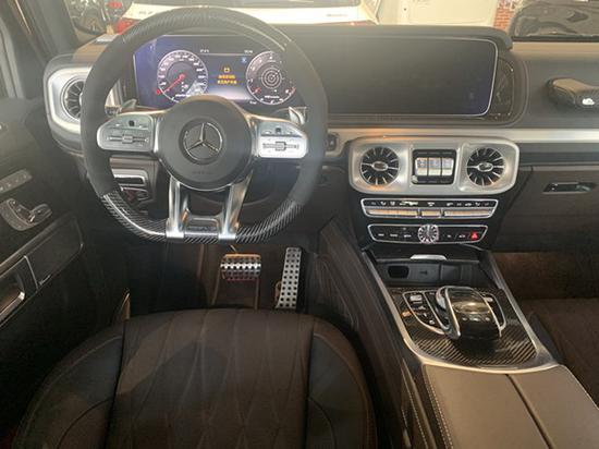 内饰肯定是这代全新奔驰G级最令人眼前一亮的地方,它可以说是一改上代沿用了近十年的内饰风格,在整体视觉上档次感与豪华度上有了质的飞跃,精选皮革搭配碳纤维中控材质装饰风格彰显了顶级经典越野车的风采。2019款奔驰G63AMG进口SUV豪车内饰设计更具时代感也更加豪华,新车还换装了全新造型的平底式AMG运动方向盘,下部镀铬装饰的造型也与新G 500明显不同,看上去十分战斗。
