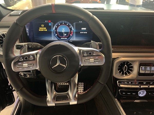 内饰肯定是这代全新奔驰G级最令人眼前一亮的地方,它可以说是一改上代沿用了十年的内饰风格,在整体视觉上档次感与豪华度上有了质的飞跃,精选皮革搭配碳纤维中控材质装饰风格彰显了顶级经典越野车的风采。2019款奔驰G63AMG进口SUV豪车内饰设计更具时代感也更加豪华,新车还换装了全新造型的平底式AMG运动方向盘,下部镀铬装饰的造型也与新G 500明显不同,看上去十分战斗。