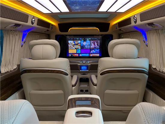 迈巴赫VS680改装中排与三排中间有一个可拆卸式的折叠大方桌可以供您娱乐就餐、办公等等,第三排同样十分豪华,三连座的沙发床,整个乘坐区的灯光开关都在第三排的扶手箱老板键上,将第三排完全放平后就是一张舒适的双人床供您休息。