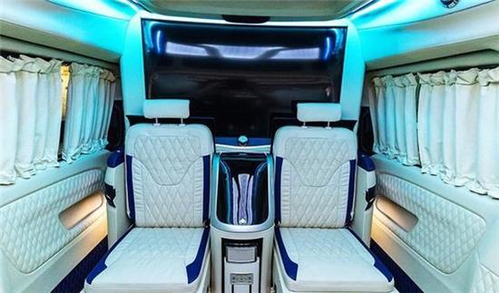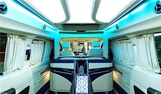 奔驰威霆房车车身尺寸为:5370*1928*2080mm,加装高顶后车身的线条更加流畅,使车内空间更高,坐在车内不会有压抑的感觉。加长3400的轴距,不止是大空间内舱的最直接体现,更为舱内的升级提供了优良的底盘基础。这台4座定制版的威霆内饰非常有特色,车舱内部米白色与蓝色的内饰搭配,大量真皮包覆车壁,地板也采用了经典商务车改装所运用的柚木地板,亮白的星钻氛围灯,带来豪华高雅的氛围。