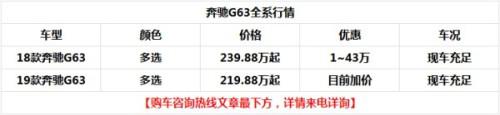 性能方面:19款奔驰G63使用5.5T V8引擎,AMG调校,最大功率585马力,最大扭矩850牛·米(老款为570马力和760牛·米),0-100km/h驾驶4.4秒,比老款快0.9秒,最高速度也由210km/h提高到了240km/h。AMG改装G63还可提供侧向排气管等更个性化的选装。