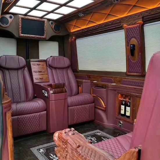 采用电动滑门,车门自动开启,迎宾踏板自动伸出,乘客轻松上车,车内打破了一般商务车小矮搓的短板,打造出总裁办公室的超大商务空间,随意行动自由自在。踩着迎宾踏板拾级而上,头顶大片景观式迈巴赫顶灯,脚踏高级定制的房车地毯,一股贵族气息立刻环绕。