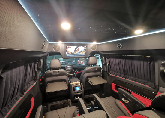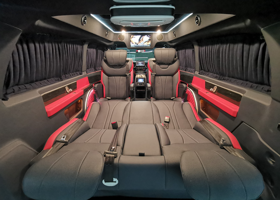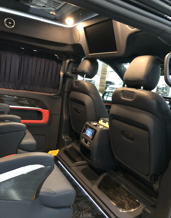 2019款奔驰V260L改装商务车第二排航空座椅为带电动、加热、按摩、通风功能的航空级首长席,可沿着地面上滑轨实现一键电动式前后滑动,对于这种智能化的乘坐体验,是原厂车型笨拙的手动拖拽模式所望尘莫及的。车内的氛围灯打开后,奔驰V260内舱变得灵活多变,气氛也可以根据主灯颜色变换而变化,主要的乘坐座椅配置的独立的按摩功能,通风加热,一体腿托,功能丰富,乘坐舒适,是商务接待用车的代步良品。