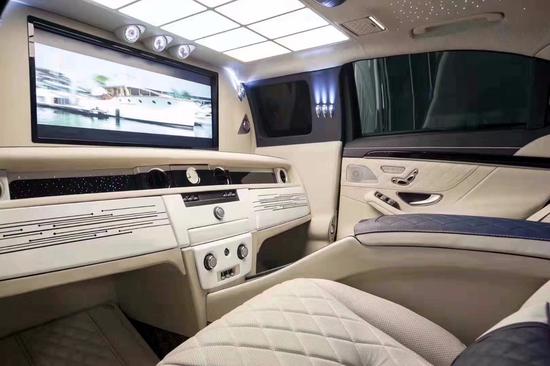 内饰配置-仪表台全包裹-迈巴赫菱形格、前门板全包裹-迈巴赫菱形格、主副驾驶座椅全包裹-迈巴赫菱形格、中央扶手双色包裹-迈巴赫菱形格、隔断整体迈巴赫顶级真皮包裹、隔断升降龙骨-带电视升降、隔断嵌入式柏林之声高级音响、隔断迈巴赫三联表、隔断原厂劳斯莱斯仪表台装饰、侧板劳斯莱斯雨伞托(含雨伞)、侧板全皮包裹、B柱射灯、后排迈巴赫中央通道、后排迈巴赫中央通道双色包裹菱形格、后排原厂迈巴赫航空座椅-菱形格包裹、迈巴赫十宫格顶灯、迈巴赫星空顶氛围灯。