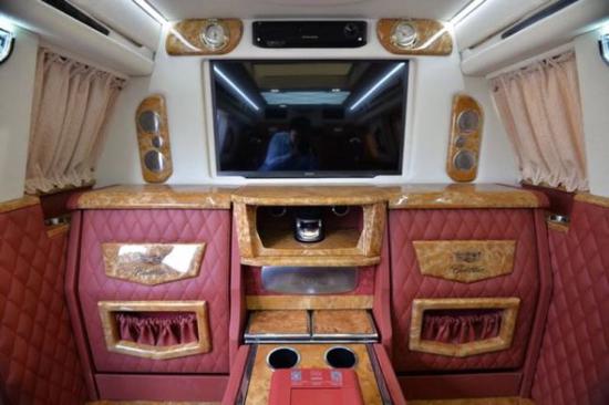 2019凯迪拉克总统一号驾驶室跟乘客区采用隔离设计,隔屏上有一块升降高清电视。下面吧台设计功能强大,集成影响,DVD,电动反向座椅及电动小桌板。