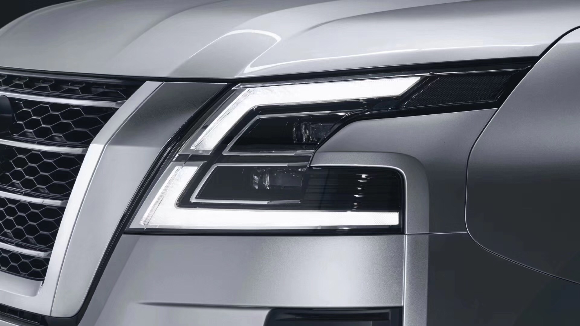 采用了最新式设计语言的新款途乐,成了目前日产家族内的“最大V-motion脸”,粗壮的平底V型镀铬饰条包围住进气格栅,搭配以辨识度极高的倒C形大灯组,看起来精致又不失霸气。