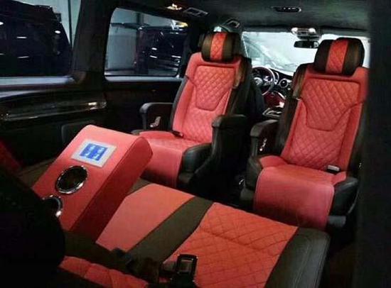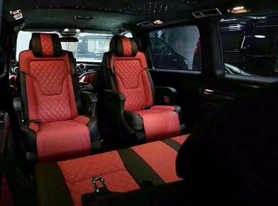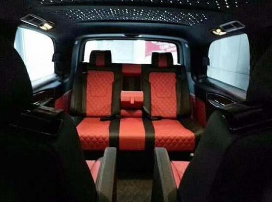 后舱是一个舒适之地,两张航空座椅规格之高超越迈巴赫,选用进口小牛皮包裹触感细腻,缝线精致,更拥有超长腿托,多向调节、电动按摩、座椅加热通风等功能。座椅双侧有电动电脑桌,在左侧还配有苹果电脑连接车内WiFi随时可在车内办公。总裁座椅中央为控制区域,超大液晶屏可实现氛围灯开关、电视升降、隐藏座椅开关、以及布艺窗帘的开关。