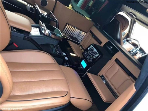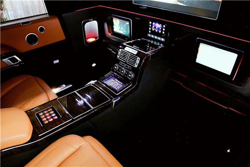路虎皇家一号加长版配有做工非常考究的吧台,全景天窗下,隔屏吧台搭载三星32寸液晶升降电 视,MERIDIAN英国之宝环绕音响,秉承着高贵与简洁的设计宗旨,清晰重现各种声音,其品质可见出类拔萃。左右下方各9.7寸液晶显示功能屏,让视觉 听觉与触控发挥到极致。内部空间阔绰,配套设备一应俱全,甚至有带密码的保险箱。用料出众,车顶和车门全部采用高档小牛皮包裹,车内还大量实木面板装饰,特殊定制的LED氛围灯也将室内打造出了另外一种场景。车内与车外一门之隔,却两种景致。