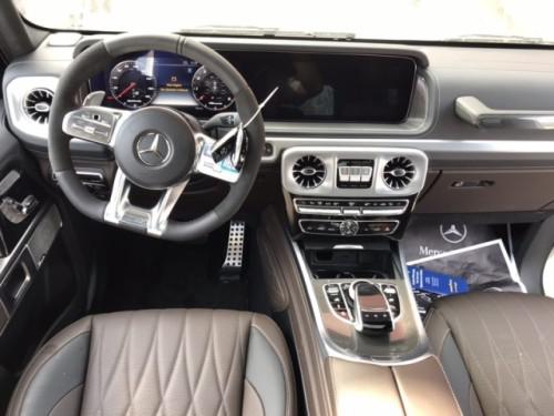 奔驰G63 (配置|询价) 美规 19款 白/咖 #268 选装:内饰加强包(菱形缝线) 纳帕真皮座椅 动态按摩 AMG红色卡钳 22轮AMG黑色轮毂 AMG运动方向盘 12.3寸宽屏 360环车影像 标配: 自动防眩目内后视镜,3区气候控制,热噪声绝缘夹层安全玻璃,加热和可调节后视镜,电加热后挡风玻璃,带有单触控制和障碍传感器的电源窗口,后挡风玻璃刮水器,带雨传感器的挡风玻璃雨刷,大灯助射,中央门锁,无钥匙启动,AMG前格栅设计,时钟,仪表板上的前乘客抓把手,越野屏幕,定速巡航,带易进入系统的电动可调式转向柱,触摸板与控制器,前座及头部调节的记忆功能,驾驶和前排乘客的扶手,前排座椅加热,可折叠的后座靠背,后排座椅头部调节,后座加热,双杯座,发光可锁定的手扶箱,后折叠扶手,全轮驱动,ECO启动/停止,Direct-steer 系统,动态选择,后座儿童锁,ESP电子稳定程序,电动驻车制动器,ABS刹车防抱死系统,ASR加速防滑控制系统,电子牵引系统,前排安全气囊,前排膝盖安全气囊,前端和翻转传感器,黑色金属漆,黑色nappa皮内饰,红色AMG卡钳,主动车道保持辅助装置,前面板不锈钢黑色,外部保护