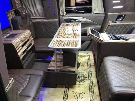 凯迪拉克总统一号隐藏六座商务车内饰部分:舱内隔断:可升降分隔屏,32寸超薄液晶电视 音响设备:BOSS环绕音响,DVD 舱内灯饰:氛围灯 LED灯饰。