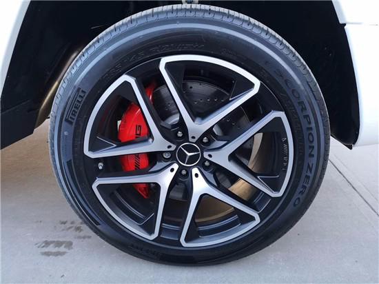 G63锻造轮圈为其带来了更轻的簧下质量和更高的强度,由Y字形辐条组成的轮圈,极具视觉张力,亚光黑色喷涂搭配一圈红色线条很有运动氛围。巨大的对向6活塞卡钳能为这台2吨多的怪兽提供足够的刹车力。