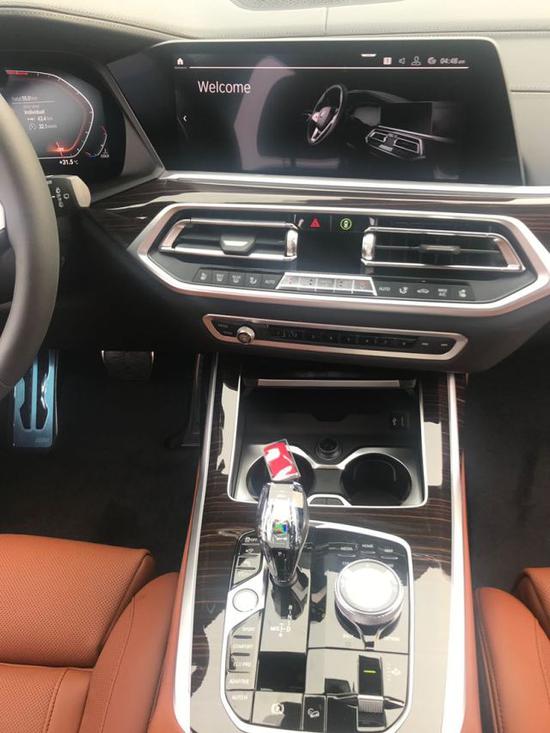 19款宝马X7 (配置|询价)内饰部分,宝马X7采用最新家族式设计语言,使用大量真皮、木纹饰板进行包裹。配备12.3英寸带有注意力检测的全液晶仪表和12.3英寸悬浮式触控显示屏。空调出风口与温度显示屏、实体功能按键结合在同一区域,并使用银色装饰条进行点缀。下方盖板下方为带有加热、制冷功能的杯架,全新的水晶电子挡杆造型十分精致,进一步提升了车内的豪华氛围。