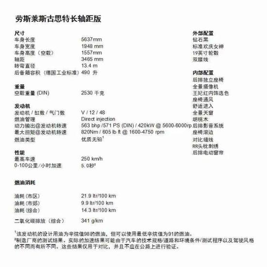 车型尺寸 5569mm*1948mm*1550mm(加长) 油 耗 13.8L/100km 引擎类型 6.6T V12发动机 最高时速 250km/h 加速时间 4.9秒(0-100km/h)驱动方式 前置后驱 制动方式 通风盘式 轴 距 3295~3465mm 油箱容积 83L 标准座位数