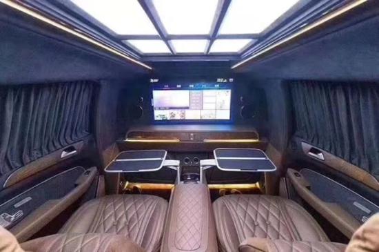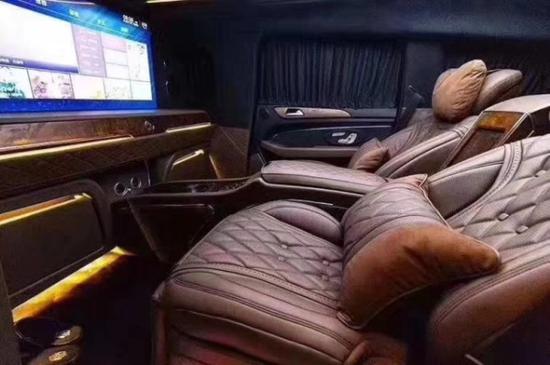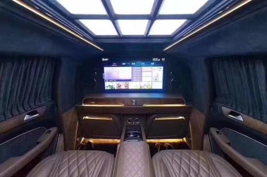 2019奔驰GLS (配置|询价)450加长版5.98米车身手工打造迈巴赫内饰绝对的亮点,整个车内几乎被真皮包裹起来,缝合线非常均匀,车门与中控台之间的搭配相当流畅,这足以表现出装配工人们手艺的精湛,可以说只要我们能摸得到的地方,绝大部分都是真皮,剩下的就是实木和金属的装饰件了。奔驰GLS (配置|询价)450加长采用2+2或2+4座椅格局,2个电动隐藏座椅+中央电动吧台组合。后车舱的豪华程度堪比私人飞机般豪华,柚木地板铺设,车身牛皮包裹,局部格棱纹设计处理。大面积的雀眼枫木装饰使内饰奢华感倍增。在吧台下方还有一张隐藏式电动商务会议桌。