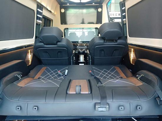 奔驰斯宾特房车的座椅格局也是与众不同,同样也是因为宽敞的车内空间。2驾驶座+2折叠秘书座椅+2航空按摩座椅+3连排沙发床,折叠秘书座椅和航空按摩座椅可以形成2对2的商务洽谈对座模式,可以满足总裁们的出行商务需求。