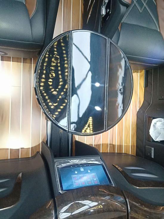 奔驰斯宾特贵宾区全景,第三排3人连排沙发,可电动躺平成床,用这个触摸屏可以控制第三排座椅的调节。无论是配套的享受、真皮的覆盖面积、内饰部件的装配工艺、科技电动水平控制乃至是细微到针脚的距离,奔驰斯宾特房车都表现出了高端商务房车应有的体验!
