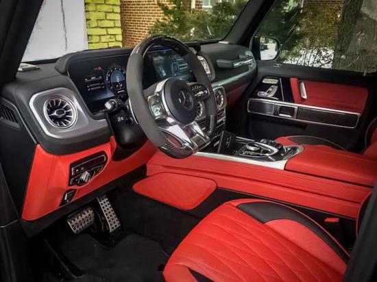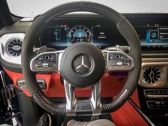 19款全新G63内饰方面,新G63保留了新G500的整体设计,除配色差异外,新车还换装了全新造型的平底式AMG运动方向盘,其两侧配以打孔皮质包裹,下部镀铬装饰的造型也与新G 500明显不同,看上去十分战斗。此外,全液晶仪表盘+中控大屏的双12.3英寸屏幕设计在新车上也没有缺席,营造出了浓郁的科技感。