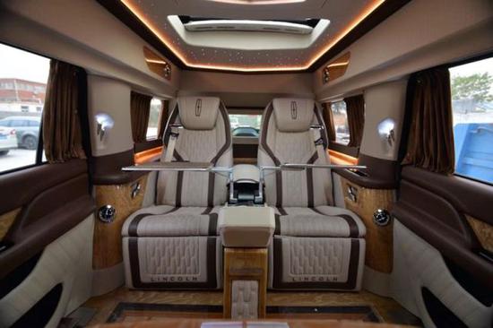 林肯领袖一号内饰配置,40寸电视,蓝光DVD,BOSE音响,对讲机,柚木地板,咖啡机,游艇钟表,电动窗帘以及航空按摩椅。4+2布局的林肯领袖一号早已家门户晓,林肯领袖一号后乘客舱4个座位数,其中吧台有两个折叠座椅可以单独打开,不使用它们时也不失美观,林肯领袖一号行驶证是4个座位数。2018款林肯领袖一号酒红内饰,图片上是美式咖啡机伸展出来图片,不使用它时可以收缩回去,不失美观。