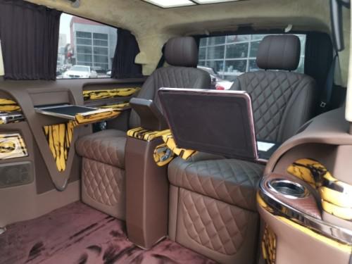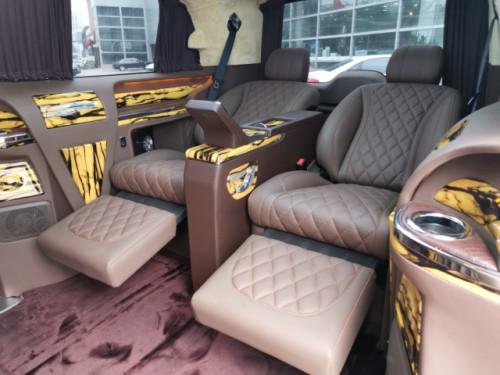 奔驰V600L安道拓7座改装商务车●全新安道拓航空座椅、气动按摩、加热、通风、一键式记忆座椅调节、腿拖调节、靠背前后调节,头枕升降,电动肩部支撑。●豪华沙发床加热、靠背调节、腿拖调节、半展平状态。●可拆卸式娱乐活动桌●沙发床后背手动储物抽屉●四季实用透明环保地膜●经典镀络衣架)限量版手工高光泽座椅扶手外观部分●车身尺寸MM5370*1928*2080(长宽高)●整车外观镀铬件装饰、镀络门踏●整车漏电保护系统。