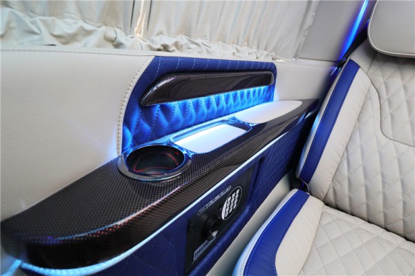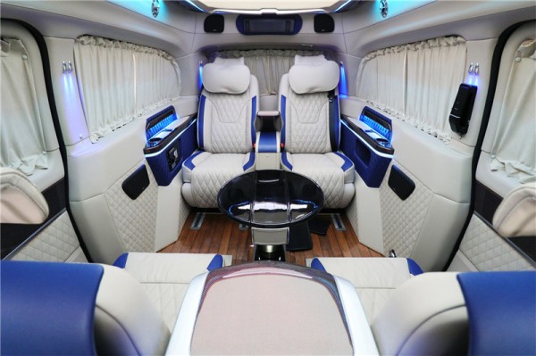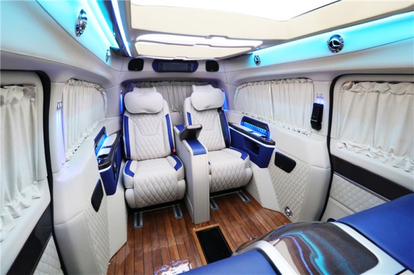 这款奔驰V级新款V260L整车采用米色加蓝色的搭载,给人一种舒适温馨的氛围。并且是采用同色系的手动窗帘,很好保证个人隐私。整车沿用阿尔法的独特座椅,让整车的格调提升到极致。