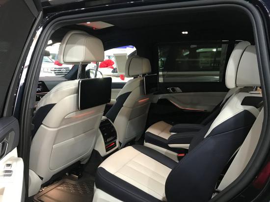 座椅方面:X7标配7座座椅,2+3+2的布局,中间两个独立座椅是选装件,在功能方面,全车座椅标配座椅加热,前排座椅可选装通风和按摩。第三排座椅也是电动 调节,后排娱乐也是选装的,除了屏幕之外,后排娱乐系统还包括蓝牙DVD、两套独立耳机、HDMI接口,另外X7为第二排和第三排各设两个USB用于充电。四驱自动空调是X7的标准配置,可以选装五区空调,这样以来第三排乘客也能自己调节温度,十分周到。另外全新宝马X7有一套香氛系统,有8种气味可供选择。