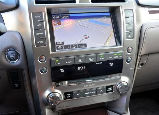来到车内,雷克萨斯GX目前的车型即将面临换代,所以还是一副老面孔,和普拉多基本布局一致,多功能方向盘采用了真皮和实木的组合,略显老气但不失典雅,可能年长的消费者会比较喜欢,而且还有黑色、棕色和灰褐色内饰可供选择。