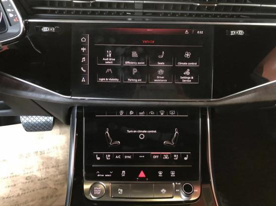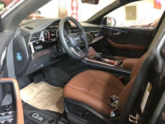 内饰方面那,进入车厢内部,会感觉奥迪Q8和全新A8的设计高度雷同。奥迪全新家族化设计,科技感十足的虚拟驾驶舱氛围,同样的三块大屏,横向贯穿的前排空调出风口。中控台采用大面积的真皮包覆,且向驾驶员一侧倾斜,形成以驾驶员为中心的驾驶舱。19款奥迪Q8标配升级版导航MMI系统,导航系统可根据以往旅程提供智能目的地建议;还可以根据驾驶时间和路况总结经验。通过可选奥迪connect互联科技钥匙,可以无钥匙进入Q8。车主可以与另外四个人共享汽车,使用安卓手机开锁、锁车以及启动发动机。标配个性化设置使车主可以在个人资料中存储多达400个优先参数,例如,驾驶员座椅位置、空调设置或经常使用的媒体和导航目的地等。