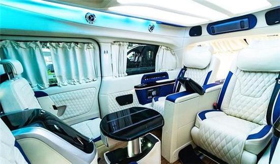 奔驰威霆房车车身尺寸为:5370*1928*2080mm,加装高顶后车身的线条更加流畅,使车内空间更高,坐在车内不会有压抑的感觉。加长3400的轴距,不止是大空间内舱的最直接体现,更为舱内的升级提供了优良的底盘基础。这台4座定制版的威霆内饰非常有特色,车舱内部米白色与蓝色的内饰搭配,大量真皮包覆车壁,地板也采用了经典商务车改装所运用的柚木地板,亮白的星钻氛围灯,带来豪华高雅的氛围。