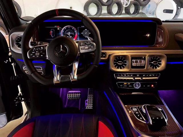内饰方面其实才全新一代G级最大的变化。新车换上了奔驰最新家族式的内饰设计,这无疑让G级拥有了旗舰级应有的豪华感,不过经典的副驾驶席扶手和三把锁的开关键依旧延续了经典设计,并设置在中控台最显眼的位置。其中双12.3英寸高清屏,虚拟仪表盘与中控液晶屏融为一体,视觉上形成一个宽屏驾驶舱,中部的涡 扇式空调出风口也颇具设计感,还大量采用了皮革的包覆。另外,新一代G级还对驾乘空间也进行了优化。全新G63内饰方面,新G63保留了新G500的整体设计,除配色差异外,新车还换装了全新造型的平底式AMG运动方向盘,其两侧配以打孔皮质包裹,下部镀铬装饰的造型也与新G500明显不同,看上去十分战斗。此外,全液晶仪表盘+中控大屏的双12.3英寸屏幕设计在新车上也没有缺席,营造出了浓郁的科技感。