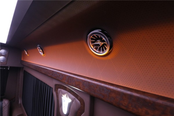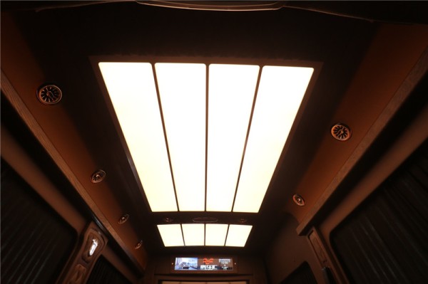 奔驰斯宾特7座房车后舱部分,智能矩阵顶棚,可变色三种光线,一键轻松改变车内氛围。奔驰斯宾特7座房车八个奔驰香氛独立出风口,让车内空气芬芳,而且也是一个非常精致美观的装饰。奔驰斯宾特7座房车超大的后排座椅还可平躺成床变成你的私人卧室。