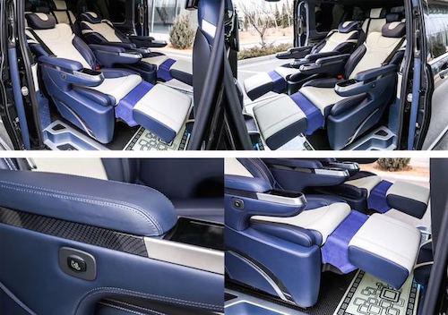 奔驰V250安道尔7座改装商务车●全新安道尔航空座椅、气动按摩、加热、通风、一键式记忆座椅调节、腿拖调节、靠背前后调节,头枕升降,电动肩部支撑。 ● 豪华沙发床加热、靠背调节、腿拖调节、半展平状态。 ● 可拆卸式娱乐活动桌 ● 沙发床后背手动储物抽屉 ● 四季实用透明环保地膜 ● 经典镀络衣架 )限量版手工高光泽座椅扶手 外观部分 ● 车身尺寸MM5370*1928*2080(长宽高) ● 整车外观镀铬件装饰、镀络门踏 ● 整车漏电保护系统。(更多车型配置及价格请关注文章尾部电话↓)