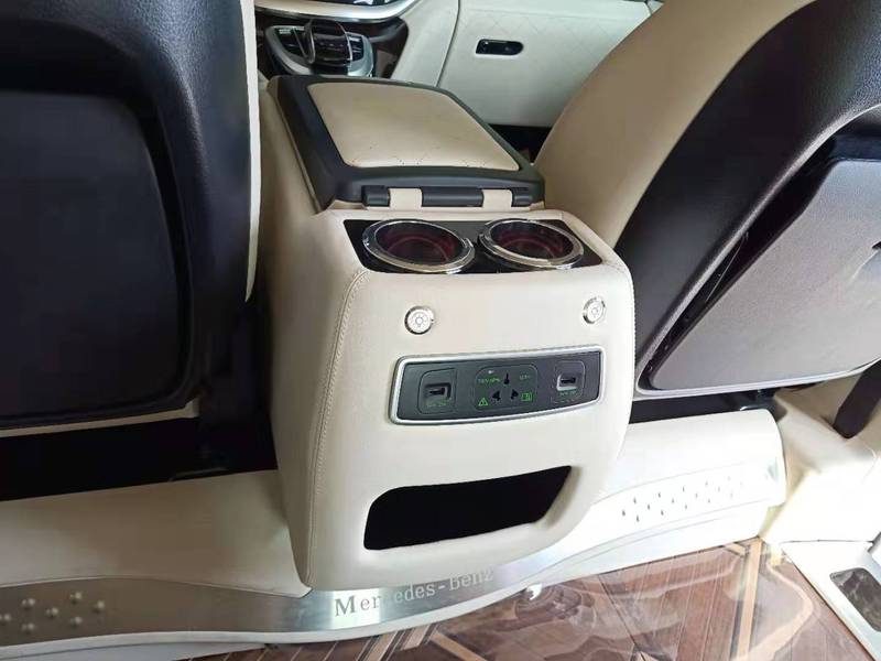 奔驰V250[可选装配置]:全车Nappa双拼色真皮座椅,第二排航空座椅(加热通风按摩),行车记录仪,后排双娱乐系统,第二排高级折叠小桌板 后舱会议模式小桌板,全景影像(带倒车轨迹),智能辅助供电系统,高性能电瓶组,220V电(1500W)220V电源插座,全车6个usb接口,左右侧电动滑门(奔驰原厂),中控液晶显示屏,方向盘黑色真皮包覆 桃木装饰,定速巡航,全包覆镀铬门把手,全车车顶进口麂皮绒包覆,乘客舱两侧氛围灯,全车地面豪华地毯 移动,乘客舱杯架,强化全车隔音降噪,桃木仪表装饰,高级桃木迎宾踏板,仪表饰件、门板饰件 桃木装饰,电动正副驾驶座椅,柏林之声音响,麂皮绒车顶附手工菱形纹缝线,LED远光大灯,全车动大包围,双排气管装饰,豪华LED日间行车灯,电动后尾门,17寸铝合金轮毂,豪华氛围后舱顶灯系统,美固车载冰箱,进口柚木地板。