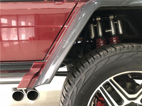 奔驰G500 4*4与平凡版G500比拟采纳越野地形底盘 四轮吊挂,拥有最高经由过程性的纯种地形越野车,奔驰G500 4*4四轮吊挂越野车的四轮轮眉宽度有了显然的增添,黑色的碳纤维轮眉赋予了整车更加刁悍的经由过程本领和越野本领的野性。2018款奔驰G500 4*4基于G500标准版打造,仍由奥地利格拉茨工厂生产。两车共用结实的梯形车架,轴距同为2850毫米。但动力系统源自新近推出的AMG GT,底盘借鉴了G63 (配置|询价) AMG6×6的设计,此外还对车身进行了一些修改。奔驰G5004X4²不过外观并不低调,前保险杠被分成了三个方形的进气口。奔驰G500 4*4轮圈则装上了和AMG款式相近的大五星款式,并采用黑色设计,加上整个黑色的车身,流露出霸气的气质。