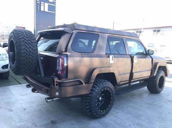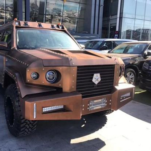 乔治巴顿越野车外观延续美系车的特点威猛霸气,全车采用装甲漆,外观尺寸为车长5900mm宽2470mm高2490mm,轴距为3580mm,车身总质量3500kg,发动机采用6.8L自然吸气V10发动机,380马力,650牛米扭矩,5速自动挡,分时四驱系统,油箱为155L,前悬挂带螺旋弹簧和加强型避震及扭力杆和纵稳定臂的桥式前悬挂系统,后悬挂室时主动液压悬挂系统,带3段式底盘升降及3种行驶模式。