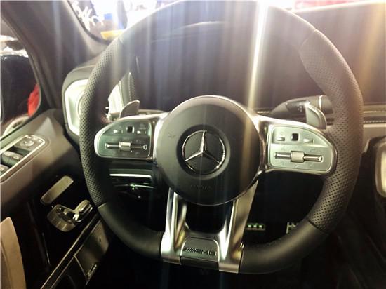 新款奔驰G63保留了新G500的整体设计,除配色差异外,新车还换装了全新造型的平底式AMG动方向盘,其两侧配以打孔皮质包裹,下部镀铬装饰的造型也与新G 500明显不同,看上去十分战斗。