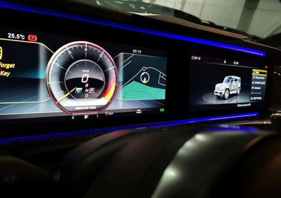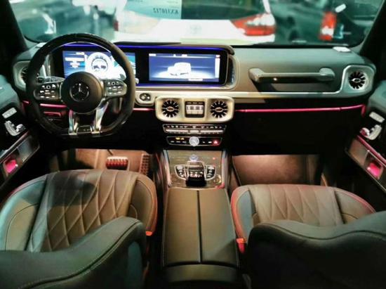 全新G63内饰方面,新G63保留了新G500的整体设计,除配色差异外,新车还换装了全新造型的平底式AMG运动方向盘,其两侧配以打孔皮质包裹,下部镀铬装饰的造型也与新G 500明显不同,看上去十分战斗。此外,全液晶仪表盘+中控大屏的双12.3英寸屏幕设计在新车上也没有缺席,营造出了浓郁的科技感,