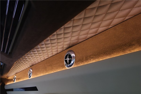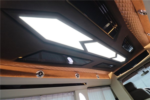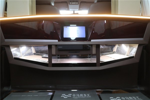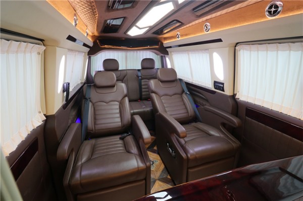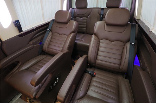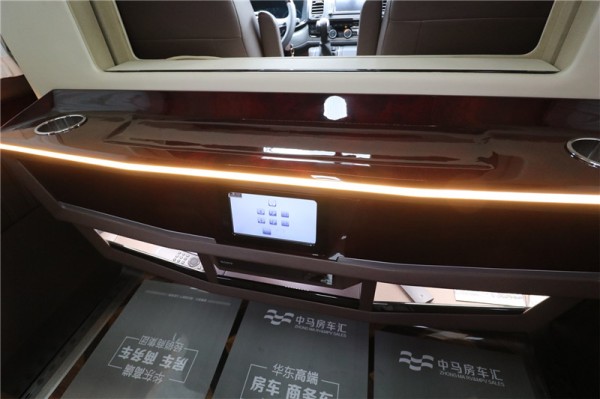 打开大众商务车迈特威电动车门之后,步入车舱,迎面而来的是两张航空座椅真皮包裹,带有180°旋转、多向电动调节、加热通风以及腿托等功能。整车后舱的规格很高,配有杯托,车载冰箱,升降电视,豪华顶灯,柚木地板等。