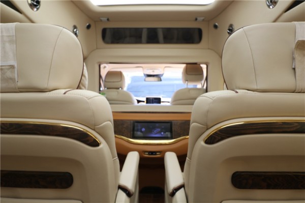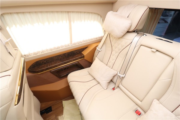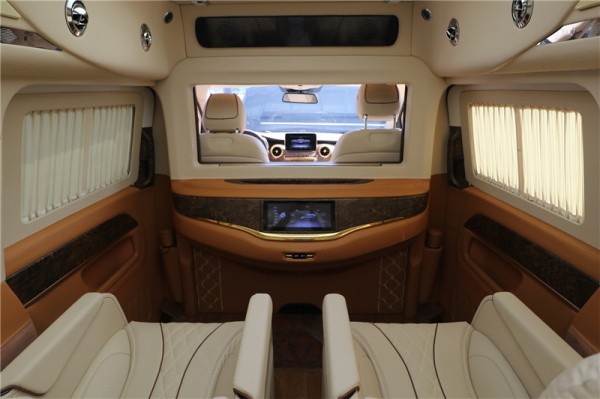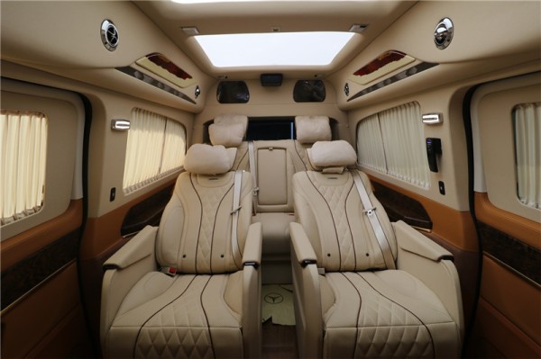国六奔驰V260L七座mpv商务车二排采用航空级总裁座椅,拥有座椅加热、通风、按摩、腿托功能,总共拥有10项座椅调节,另外再搭配实木地板,为整个乘坐舱内带来大气,温馨的色彩。整车防紫外线隔热玻璃能够有效阻挡夏日强光,两侧隐私电动窗帘搭配盘绕车内的窗帘让你享受静谧的私人领域,而带遮光帘的天幕式全景天窗,营造通透大气的车内空间。