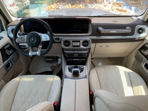 19款奔驰G63的内饰可以说极具有诱惑力。方向盘采用了AMG平底式全新造型的动方向盘搭配银色碳纤维设计彰显时尚。车内的高档皮革内饰以及标有V12钻石图案设计的座椅、车门面板和脚垫,无不彰显着车主的尊贵身份!