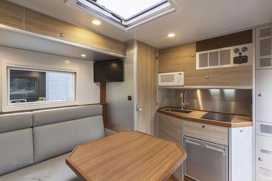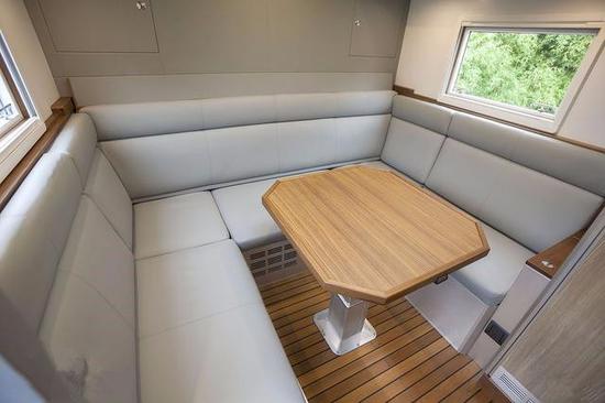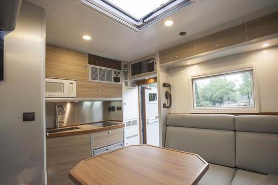 车身布置了u型沙发座椅,这是车内的主要会客区,需要的时候,这里能够拼出一张沙发床。
