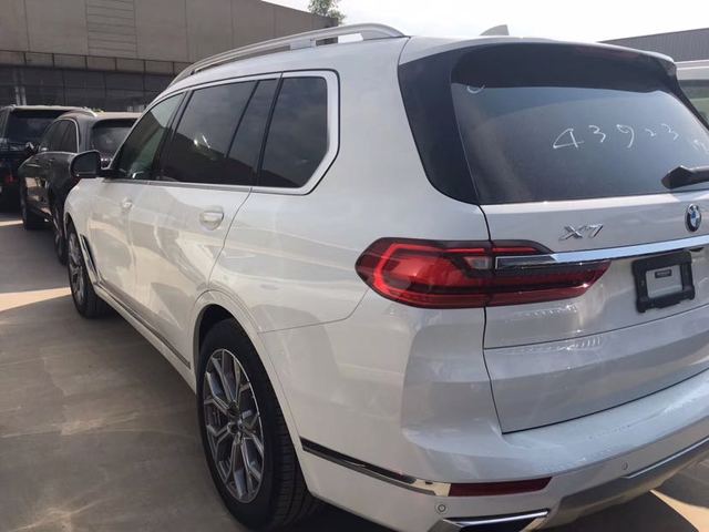 19款宝马X7车身侧面上方配有黑色行李架,前翼子板下方为长条状空气导流槽,腰线较为低矮且呈上扬之势,选用21英寸双五辐式拼色轮毂。车尾造型方正,LED尾灯组与粗壮的银色饰条贯穿相连,采用上下分段式电动尾门,排气采用双边共四出式布局,保险杠下方两侧配有大尺寸镀铬尾喉装饰。