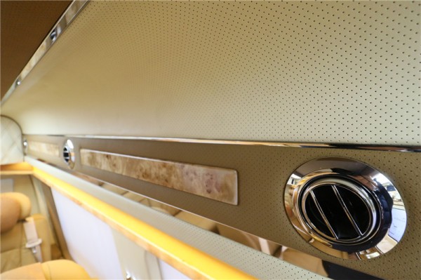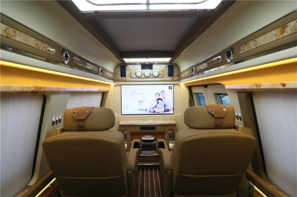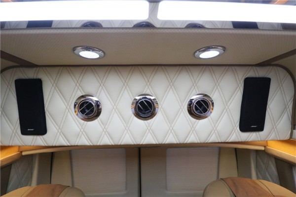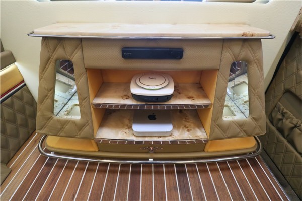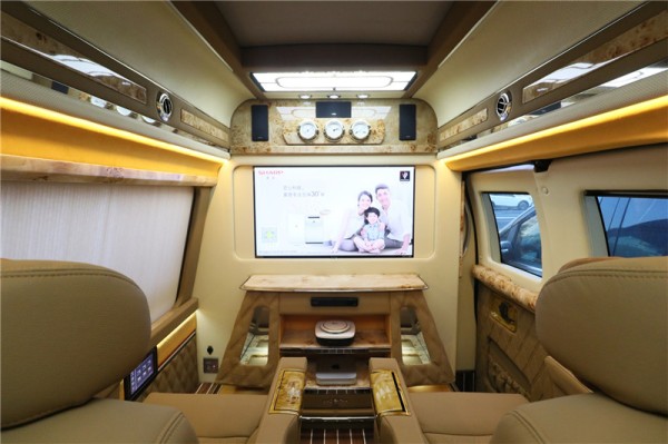 GMC商务车七座全车隐私玻璃,精选皮革包裹车身,脚下全实木地板+定制的高密丝绒地毯铺设,前后舱科技隐私隔断,大尺寸高清液晶电视可升降处理,外加柏林之声顶级豪华音响加持,独立DVD系统组合,堪称是影院级别的视听享受。冰箱、吧台、保险柜、酒柜、游艇时钟套件等,酒店豪华套房所具有的设备均是一应俱全。