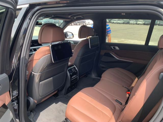 座椅方面:X7标配7座座椅,2 3 2的布局,中间两个独立座椅是选装件,在功能方面,全车座椅标配座椅加热,前排座椅可选装通风和按摩。四驱自动空调是X7的标准配置,可以选装五区空调,这样以来第三排乘客也能自己调节温度,十分周到。另外全新宝马X7有一套香氛系统,有8种气味可供选择。 第三排座椅也是电动 调节。后排娱乐也是选装的,除了屏幕之外,后排娱乐系统还包括蓝牙DVD、两套独立耳机、HDMI接口,另外X7为第二排和第三排各设两个USB用于充电。
