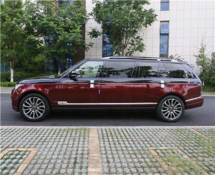 路虎皇家一号侧面气场就很明显,5980*1980*2000mm整车的数据,揽胜加长在皇家一号面前就有点小了,皇家一号依旧悬浮式的车顶,两边的鲨鱼鳃也是经典设计,加高的车身,让头部空间非要宽裕。