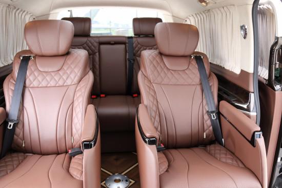 进入后舱,立刻就会被它的豪华绚丽而征服,驾驶舱与后舱是分隔设计的,形成两个独立的空间。中间由一台超大液晶升降电视(32寸)及柚木多功能吧台及柏林之声音响组成,整车环保真皮包裹,金网花地板铺设,豪华感无处不在。全部采用真皮制作,豪华木饰装点,装有按摩加热通风功能。后舱前为两个独立航空座椅,后为一组沙发座椅(可电动展平,形成一张舒适的沙发床)。奔驰V260在内部装潢上也进行升级,车体提供真皮、Alcantara以及木材和碳纤维多种材质可供选择。后排对于了解奔驰威霆商务车改装的车友应该很熟悉了,标配的三连电动沙发座椅,支持180度电动平躺,豪华双人大床配置,从此告别局促、拘谨的乘车体验,旅途中消解疲乏的不二佳选,让商务精英们时刻以崭新的姿态迎接各种挑战。