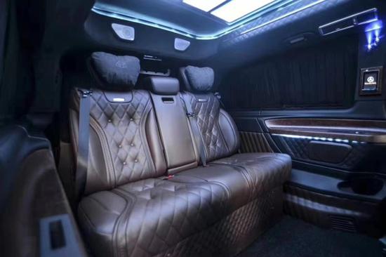 以下这款奔驰V (配置|询价)250L商务车改装车是根据我国的旅程情况和国人的实践用车需求,包括奔驰V250L外观改装、操纵改装、内饰改装,奔驰商务车是集商务贵宾、郊游、办公娱乐于一体的高端MPV,外观顺畅的车身流线搭配高顶设计,摆脱了传统商务车的笨拙,看起来十分的稳重大气,内饰通过改装实现了满足商务接待、洽谈、出游等各种出行需求。