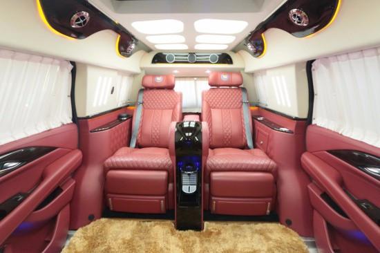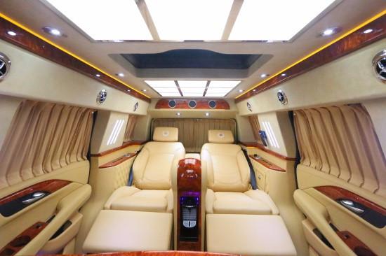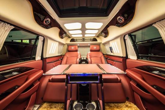 2019款凯迪拉克总统一号躲藏六座商务车内饰部分:舱内间隔:可升降分隔屏,32寸超薄液晶电视 音响设备:BOSS盘绕音响,DVD 舱内灯饰:氛围灯 LED灯饰,迈巴赫棚顶灯 舱内吧台:酒柜 咖啡机舱内桌板:电动躲藏式伸缩桌板 地板材质:柚木地板 舱内天窗:全景敞开式大天窗。