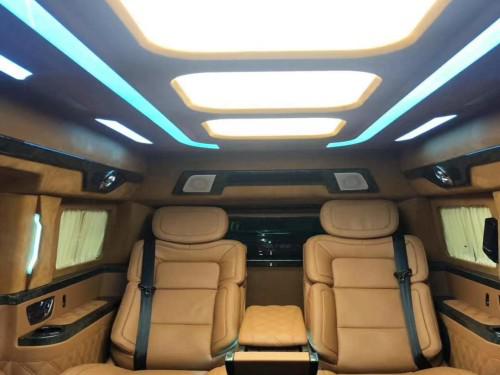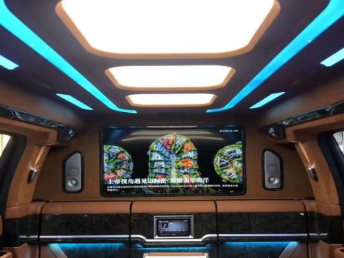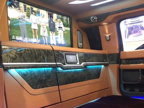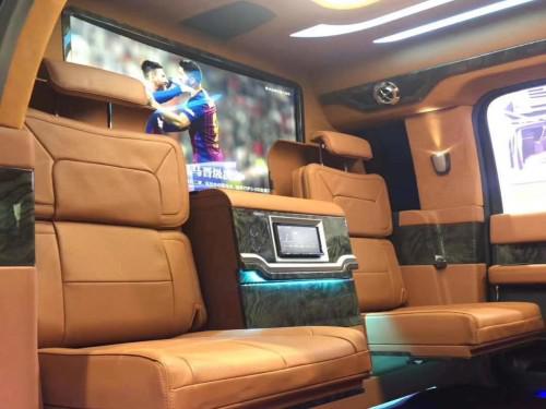 19款林肯领袖一号的内饰是纯手工打造,内饰布局上前后舱隔开设计,隔断上配置升降电视,座椅则是对坐设计,再通过各种巧妙的设计,让各种电子设备融入车内。