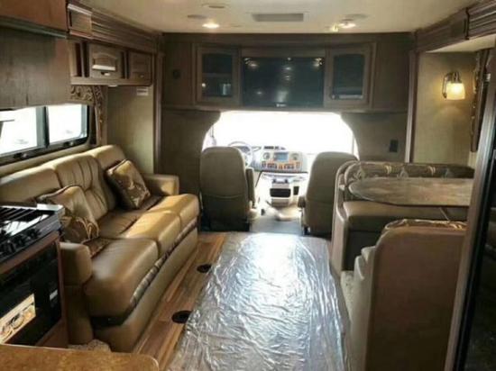 车主打开车门让我们看到了这辆福特E450的车厢,兼具“房”与“车”两大功能,车内有居家必备的基本设施,车厢内的室内高为1.98米,宽2.43米,超级豪华大房车,长途商务最适合不过,毕竟能买的起此车的老板都是按照分钟算钱的,因此内饰必须豪华。
